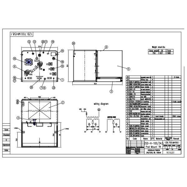 | Rating | High voltage(kV) | No Load Loss | On load Loss | Height | Depth | Width | Oil Weight(kg) | Total Weight(kg) |